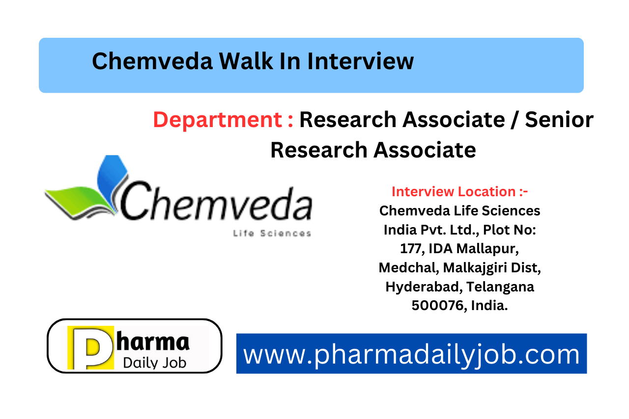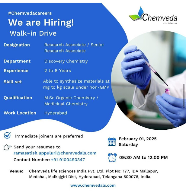 Are you passionate about chemistry and looking for a dynamic work environment? Chemveda Life Sciences is hiring talented individuals for the roles of Research Associate and Senior Research Associate in our Discovery Chemistry department. We invite you to our walk-in drive!