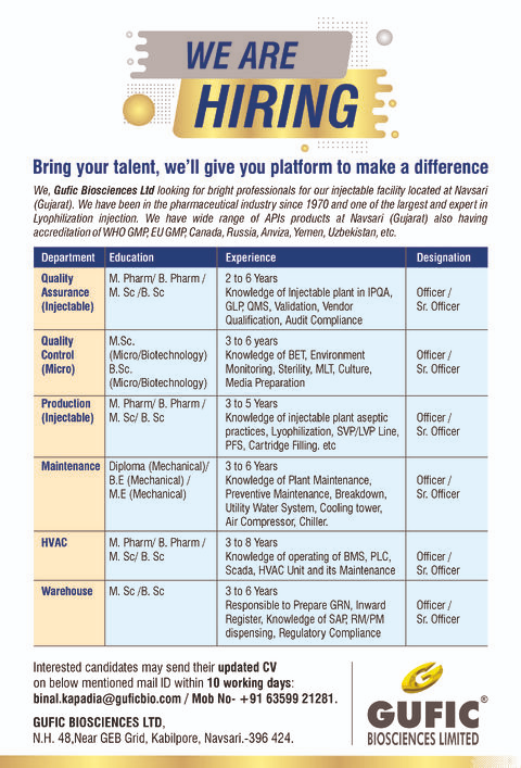 Gufic Biosciences Limited is inviting applications for Officer / Sr. Officer roles in QA, QC (Microbiology), Production, Maintenance, HVAC, and Warehouse.
