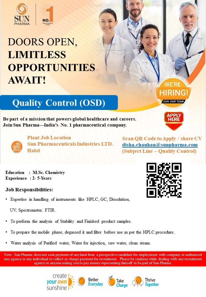 If you are a chemistry professional looking for a high-growth opportunity in the pharmaceutical industry, Sun Pharmaceutical Industries Limited has announced exciting openings in its Quality Control (OSD) department at Halol, Gujarat.